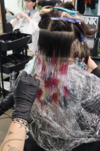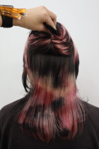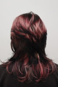 This provided our stylists with a “White Canvas” to explore the intersection of romance and rebellion. Because the blonde was already lightened, we skipped the chemicals and went straight to the art: a single-process hand-painting session using a palette of Passion Red, Love Pink, and Deep Raven.