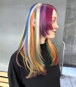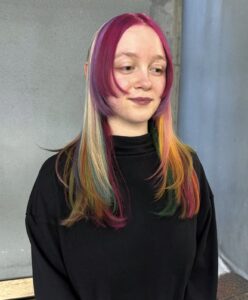 Long Layers: The rest of the hair maintains its length with subtle layering, allowing the rainbow colors to flow effortlessly.