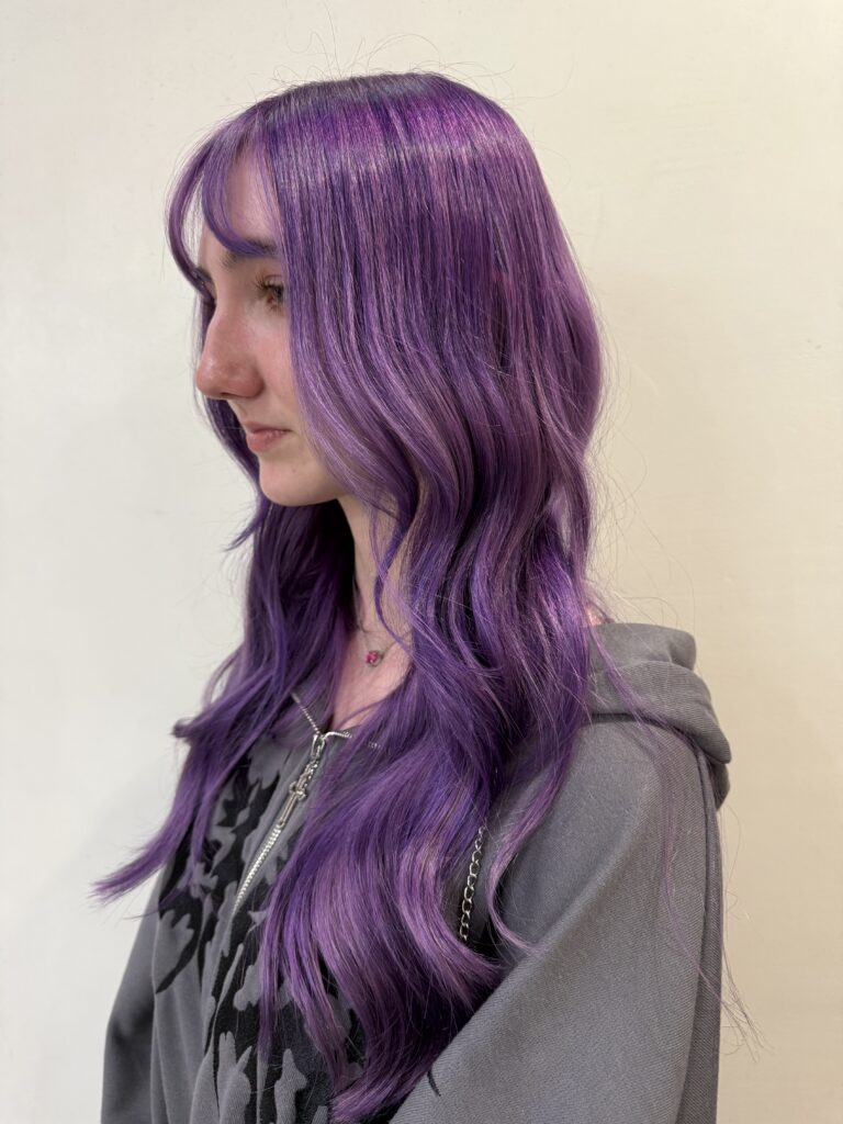 The Vivid Deposit: Applying the final custom-blended purple hue to the perfectly prepped hair for maximum vibrancy and shine.
